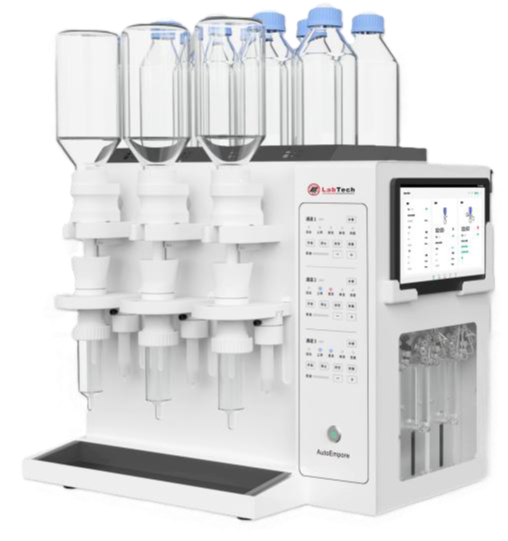 The AutoEmpore supports 25 mm, 47 mm, and 90 mm disks, as well as 3 mL and 6 mL cartridges, and features automatic online filtration and water removal for seamless operation.